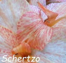 Annjee Baby with mid soft pink blooms bordered with cream, labellum is heavily splotched with a creamy yellow tone, raised in Australia 2006. Easily grows to one meter tall above green foliage and sets seed. Recent new release of this very rare Australian cultivar. Canna Annjee Baby is a seedling from the beautiful but much darker pink canna Annjee.