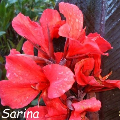 Canna Cardinal, with distinctive big blooms of orange n scarlet heavily overlaid n spotted, broad dark foliage, grows up to 1.6 meters tall, seeds no.